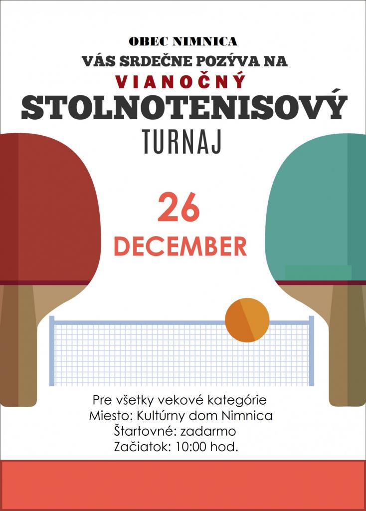 Obec Nimnica Vás srdečne pozýva na tradičný vianočný stolnotenisový turnaj, ktorý sa uskutoční v utorok, 26. decembra 2023 so začiatkom o 10:00 hod. Registrovať sa môžu len občania s trvalým pobytom v Nimnici.