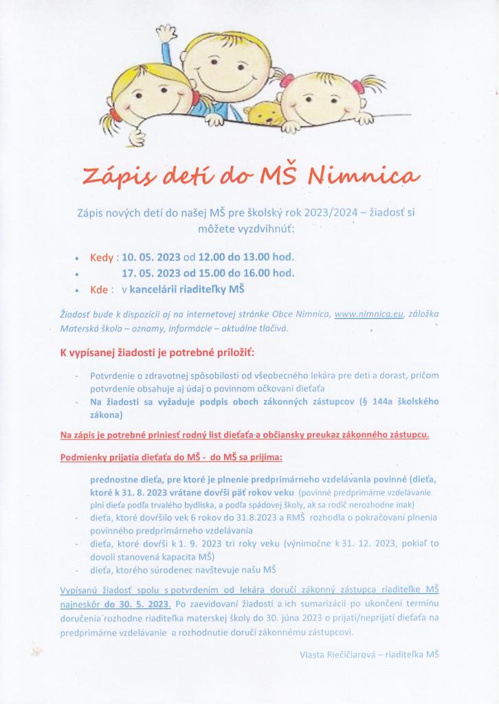 Zápis detí do Materskej školy Nimnica na šk. rok 2023/2024