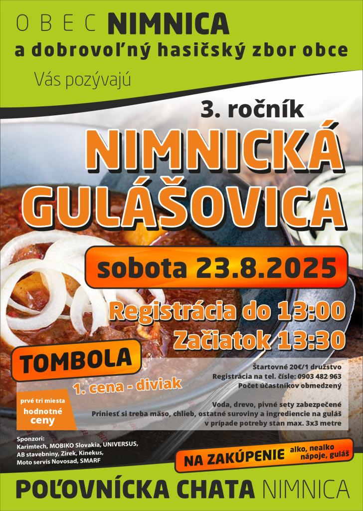 Obec Nimnica a dobrovoľný hasičský zbor organizuje 3. ročník obľúbenej sútaže vo varení gulášu. Variť sa bude na poľovníckej chate v Nimnici, len pár metrov pred Ovčou farmou v Nimnici.